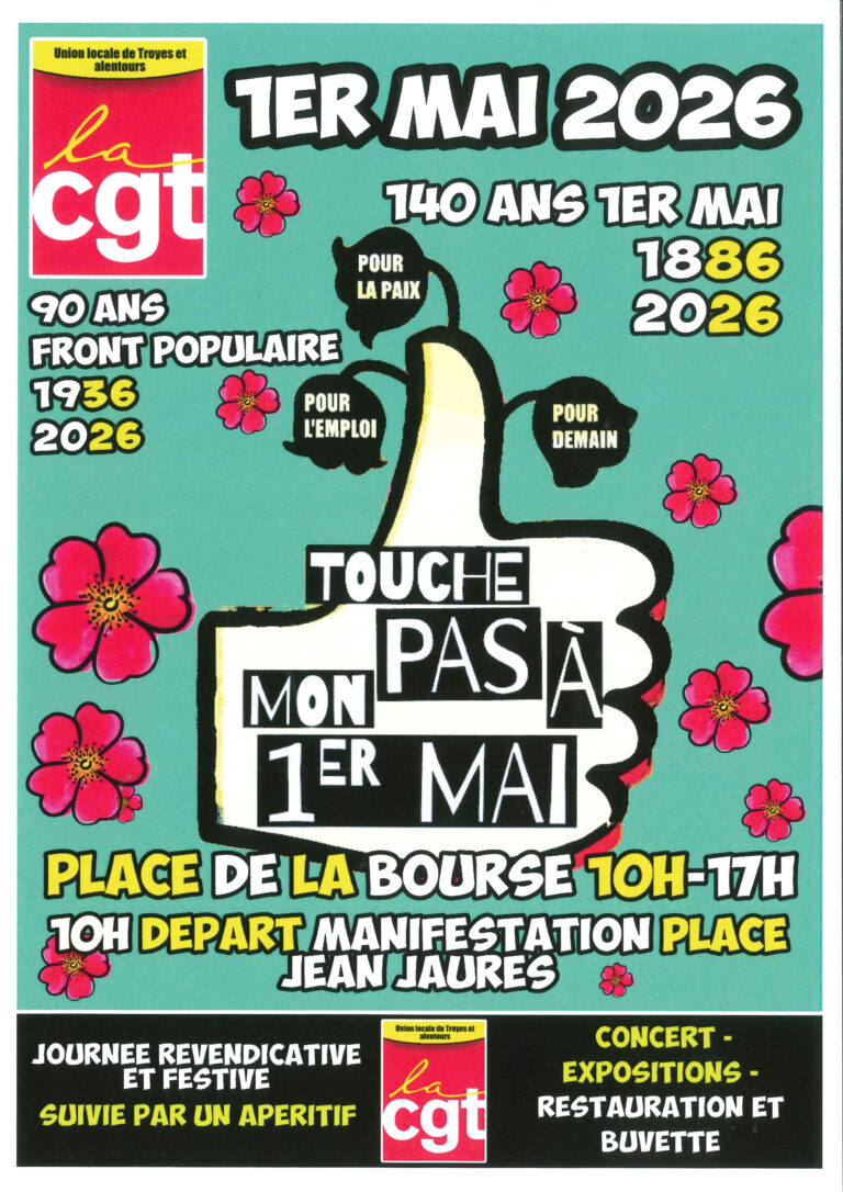 1er Mai Sous la pression de la mobilisation, le gouvernement a annoncé renoncer à sa loi contestée. Ce recul constitue un succès significatif pour les salariés, les retraités et la jeunesse. Dans l’Aube, les manifestations...